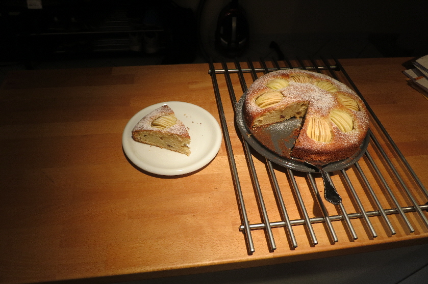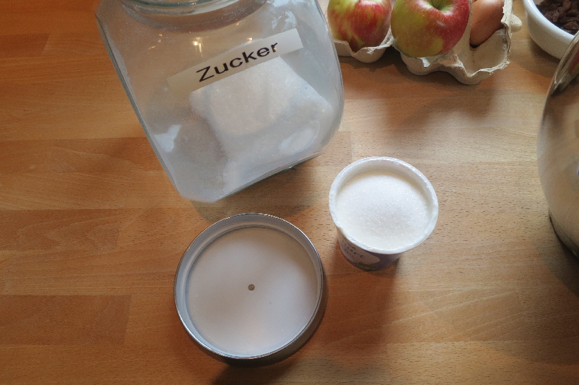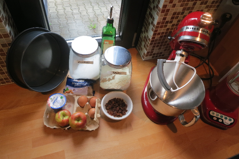 Zutaten: 1 Becher Joghurt 3,5 % Fett (150g), Sonnenblumen- oder Rapsöl, Zucker, Mehl, Backpulver, 3 Eier, gemahlene Nüsse, Rosinen, gemahlener Zimt, 2 Äpfel, eventuell Puderzucker.