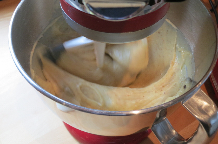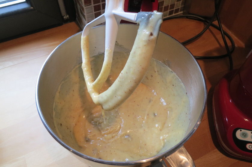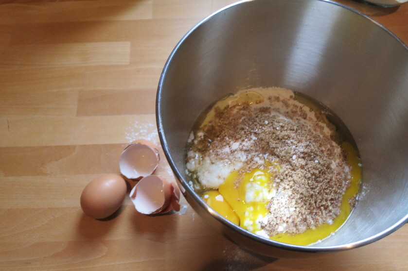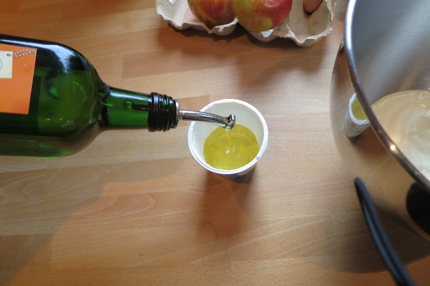 Den Joghurt in die Rührschüssel geben, mit einem Löffel alles ziemlich gut herauskratzen, den Becher 1 x mit Öl füllen (nicht bis zum oberen Rand, sondern etwa so hoch wie der Joghurt), auch in die Rührschüssel, ebenso zwei Becher Zucker, 3 Becher Mehl, 2 Teelöffel Backpulver, 5 Esslöffel gemahlene Nüsse, nach belieben noch 2-3 Esslöffel Rosinen und 1/2 Teelöffel gemahlenen Zimt. Alles mit dem Mixer in 2-3 min. zu einem gleichmäßigen Teig verrühren.