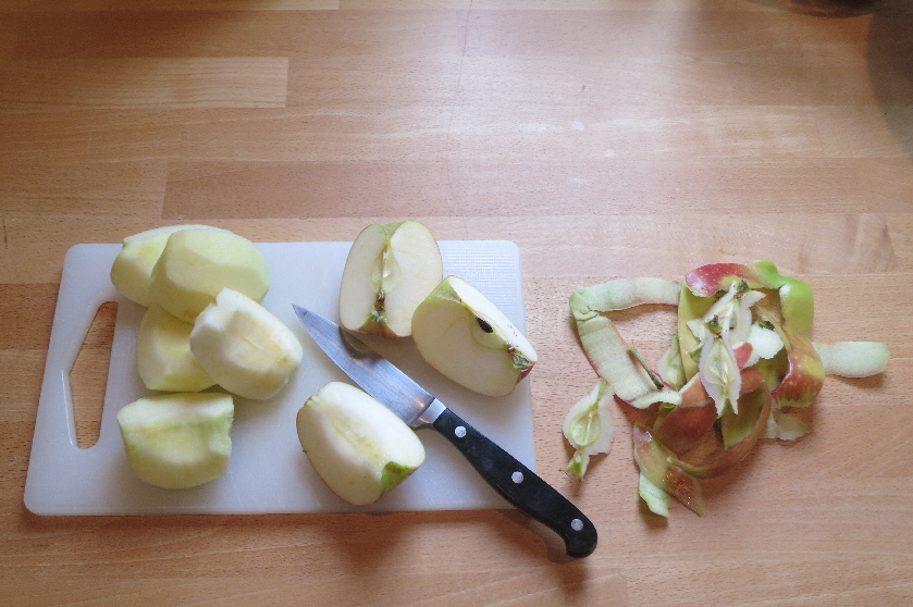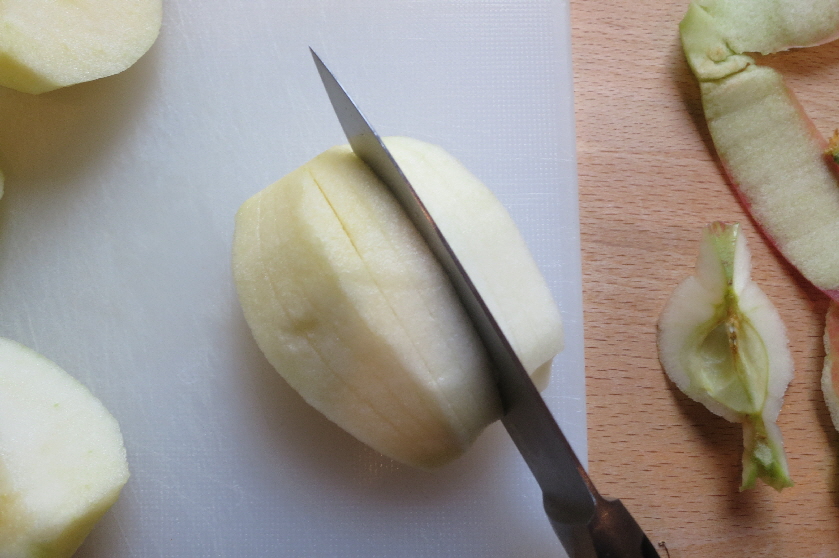 Die Äpfel vierteln, schälen und das Kerngehäuse entfernen. Die Außenseite mit dem Küchenmesser in 3-5 mm Abstand einschneiden (nicht durchschneiden). Dann blättert der Apfel beim Backen schön auf.