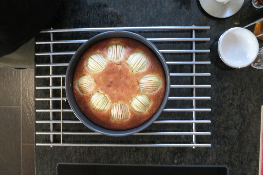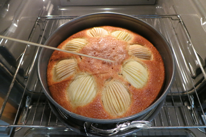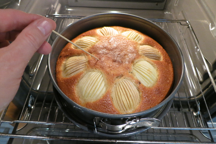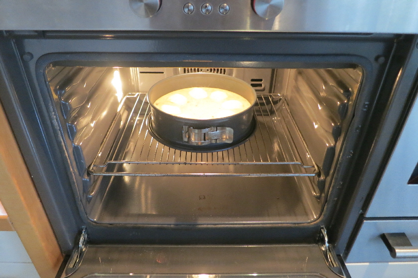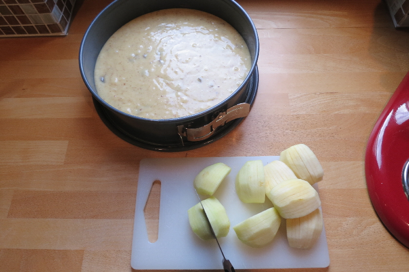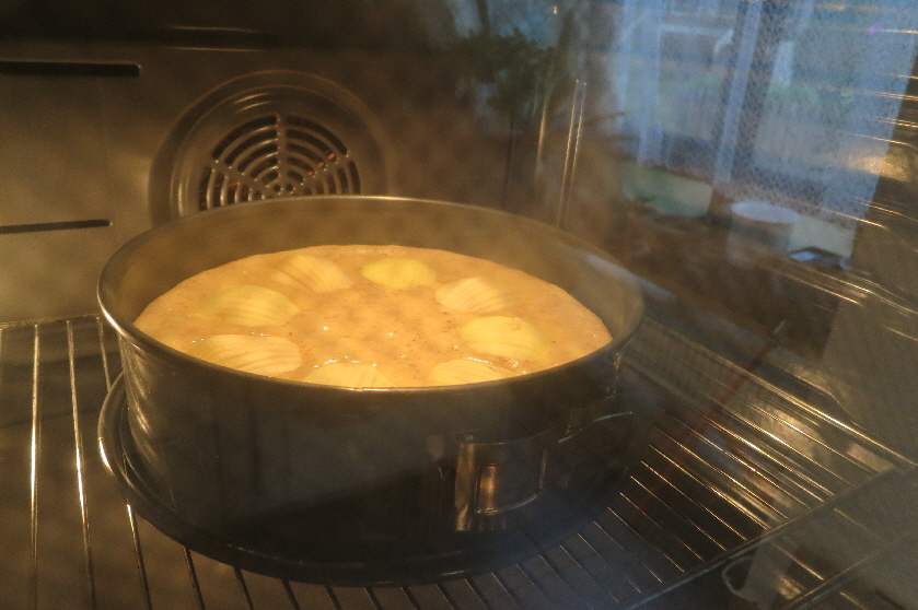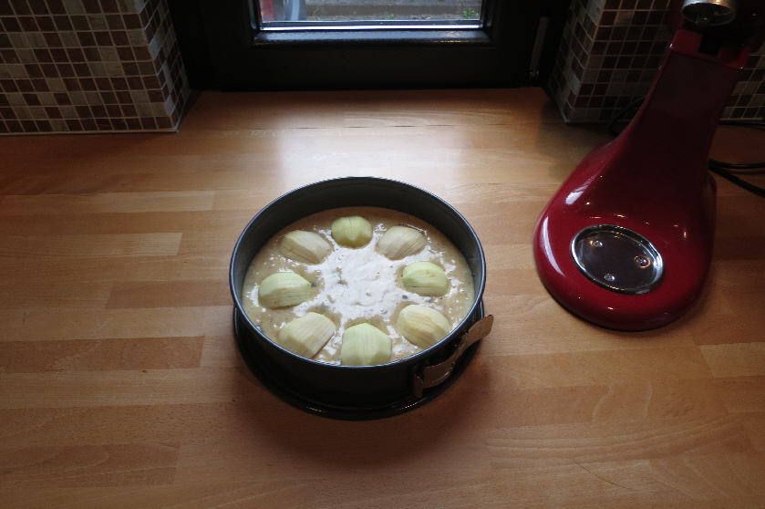 Die Springform (26 cm) gut einfetten. Dazu etwa einen Teelöffel zimmerwarme Butter auf dem Boden und am Rand der Farm verstreichen. Das geht mit einem Pinsel, etwas von der Butterverpackung oder einfach mit den Fingern. Den Teig in die Form füllen und die Apfelviertel im Kreis darauf setzen. Den Kuchen auf dem Rost in den Backofen schieben, so dass er etwa in der Mitte des Backofens steht. Nicht zu weit unten oder oben, sonst kann er unten oder oben anbrennen. Für mindestens 45-50 min backen. Dann die Garprobe machen: ein Holzstäbchen (Zahnstocher, Grillspieß oder ähnliches) in den Teig stecken und herausziehen. Wenn nichts mehr daran klebt ist der Kuchen fertig. Wenn noch weicher Teig am Holz klebt, den Ofen ausschalten und den Kuchen noch mal 10-15 min im ausgeschalteten Ofen stehen lassen. Garprobe wiederholen und bei Bedarf noch weitere 10-15 min im ausgeschalteten Ofen lassen.