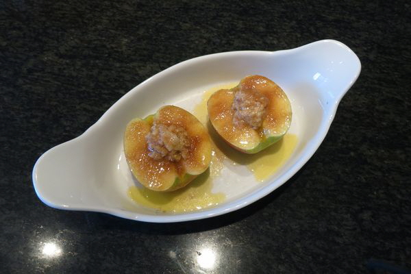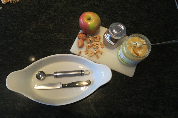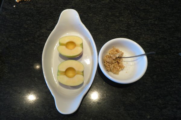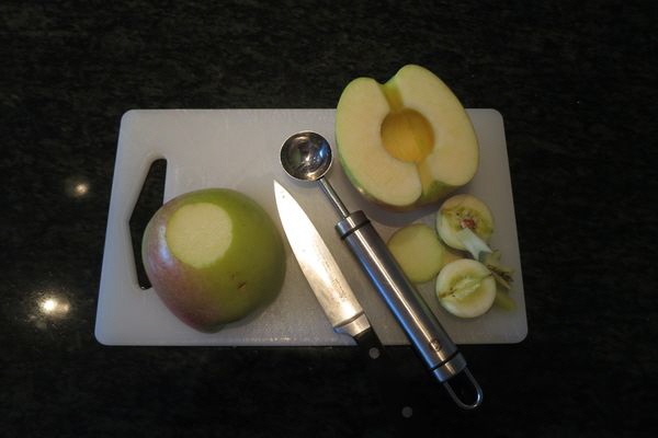 Backofen auf 160 °C vorheizen. Einen Apfel halbieren und das Kerngehäuse entfernen. Das geht leicht mit einem Kugelausstecher. Ein Küchenmesser tut es aber auch. Noch Stilansatz und Blüte entfernen und auf der Rückseite etwas flach schneiden. Dann kullert er in der Auflaufform nicht weg.