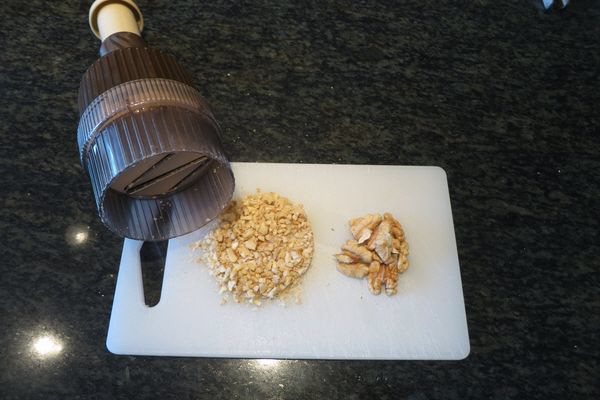 Eine Füllung vorbereiten. Auf den Bildern ist eine Mischung aus gehackten Walnüssen und Honig gezeigt. Es geht aber auch Marzipan, Mandeln, Rosinen, oder, oder, oder... Auf was man gerade Lust hat. Nebenbei einen Esslöffel Butter schmelzen.
