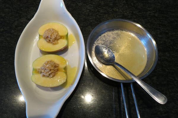 Masse in die ausgehöhlten Äpfel füllen und die Äpfel in der Auflaufform mit flüssiger Butter übergieße. Den Rand der Äpfel mit Zimt-Zucker bestreuen. Im Ofen 30-40 min backen. Auf jeden Fall nach 30 min schon mal nachschauen. Wenn der Zucker schon zu dunkel wird gleich herausnehmen, sonst wird er bitter.