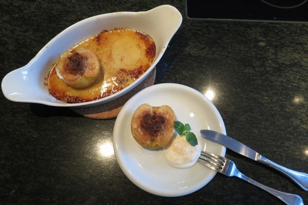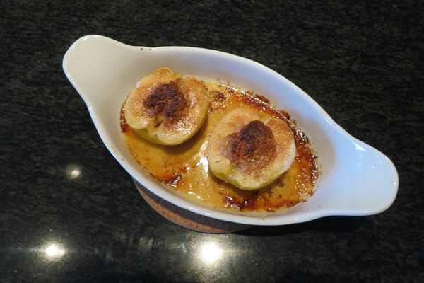 Im Ofen ist aus dem Fruchtsaft zusammen mit der Butter und dem Zucker ein aromatisches Karamell entstanden. Das sollte man sich nicht entgehen lassen. Achtung: sehr heiß! Bratapfel schmeckt gut zu Vanilleeis, mit Vanillesauce oder einfach mit einem Klecks saurer Sahne oder Crème fraîche.