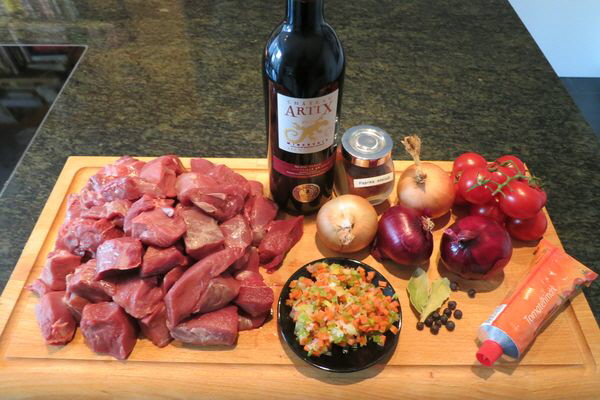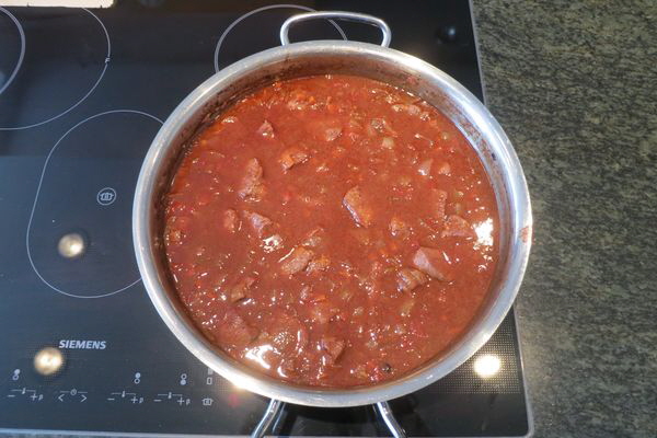 In der Pfanne sollte nun ein rost-brauner (nicht schwarzer) Bratensatz entstanden sein, so wie auf dem Bild rechts oben. Hitze auf 6 von 9 reduzieren. Zwiebeln und Röstgemüse zugeben und für etwa 3 min braten. Jetzt drei große Esslöffel Tomatenmark aus der Tube zugeben, unterrühren und weitere 3min rösten. Dabei bräunt das Tomatenmark. 1/2 Glas trockenen Rotwein angießen und so lange weiterrühren bis der Wein verkocht ist. Es wird nun alles etwas cremiger. Wieder 1/2 Glas Rotwein angießen und wieder einkochen bis der Wein verdampft ist. Und noch ein drittes mal. Jetzt sollte eine rot-braune, cremige Saucengrundlage entstanden sein. Die Tomatenstücke und eventuell die Paprika kommen jetzt dazu. Noch einmal gut durchrühren bevor das Fleisch wieder dazu kommt. Nachdem das Fleisch wieder zugegeben ist, alles mit Rotwein begießen, bis es fast komplett bedeckt ist. Zum Würzen 10 Wachholderbeeren und 2 Lorbeerblätter zugeben. Kein Salz - das kommt erst ganz zum Schluss! Die Phase der Saucenvorbereitung ist auf den Bildern rechts Schritt für Schritt dargestellt.
