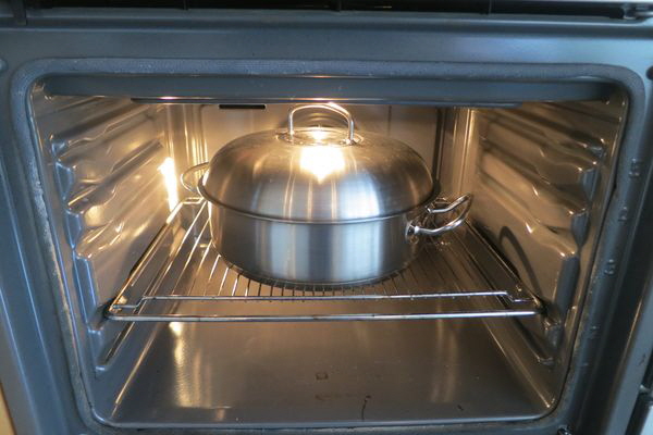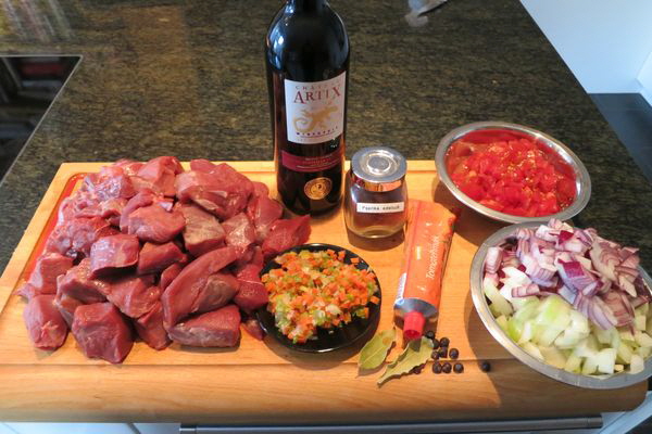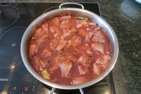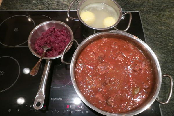 Wenn es zu kochen beginnt, Deckel auflegen und in den auf 130 °C vorgeheizten Backofen. Nach etwa 2 Stunden herausnehmen, gut umrühren und wieder in den Backofen. Nach weiteren 2 Stunden wieder herausnehmen, einen gehäuften Esslöffel Mehl mit einer halben Tasse kaltem Wasser verquirlen und unter das Gulasch rühren. Noch mal in den Ofen für eine weitere Stunde. Dann ist das Gulasch fertig. In dieser letzten Stunde kann man Rotkohl zubereiten und die Klöße kochen.