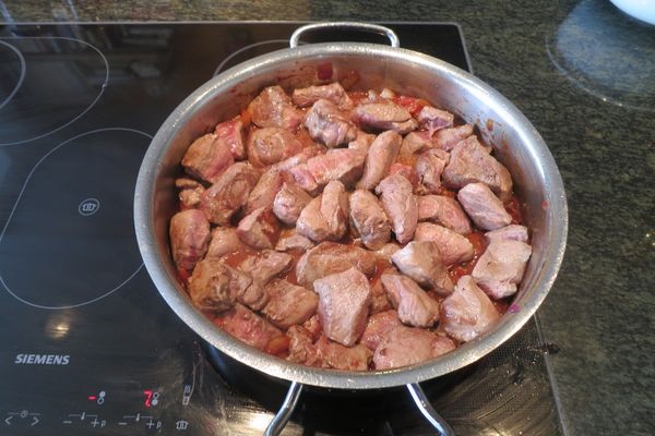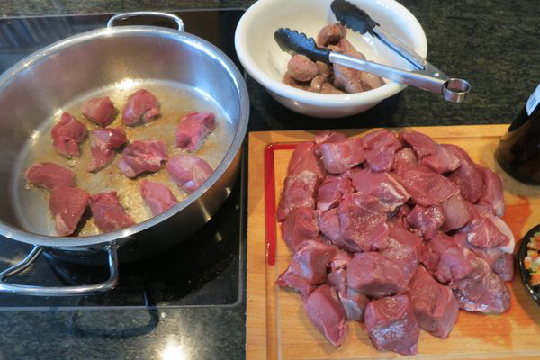 In der Pfanne erhitzt man Öl oder Schmalz (Stufe 7 von 9) und brät die Fleischstücke nacheinander an. Am besten in mehreren Portionen, damit die Stücke nicht übereinander liegen. Denn sonst tritt zu viel Saft aus und das Fleisch kocht anstatt zu braten. Herausnehmen und beiseite stellen.