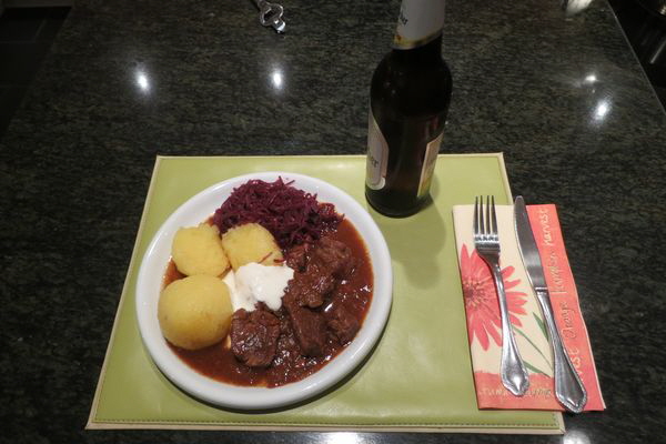 Erst jetzt wird das Gulasch mit Salz abgeschmeckt. Eventuell wird gar keines benötigt, weil es bereits aromatisch genug ist. Auf dem Teller mit Klößen und Rotkohl anrichten. Ich mag gerne noch einen Klecks saure Sahne dazu.