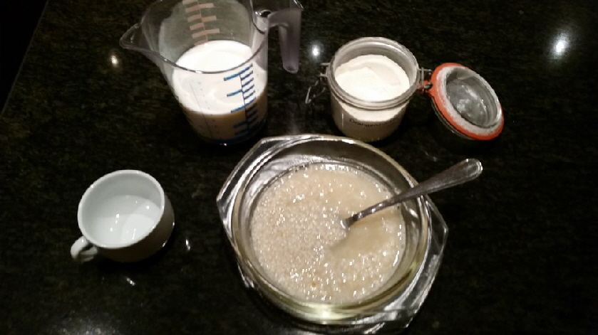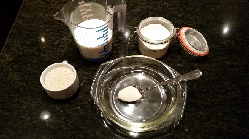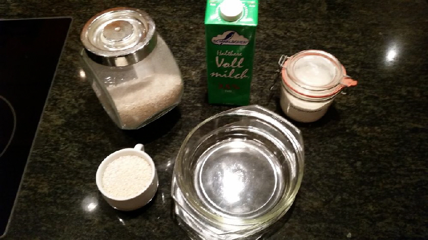Vorbereitung: 120 g Rundkornreis (Milch- , Risotto- oder Paella-Reis) abwiegen, 150 ml Wasser abmessen und in einer Glasschüssel bereitstellen, 400 ml Milch abmessen, 1 Esslöffel Zucker und eventuell 1 Tütchen Vanillezucker bereithalten. Ich hatte selbstgemachten Orangenzucker verwendet.