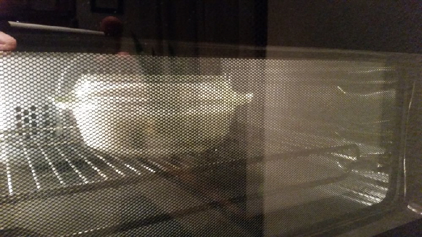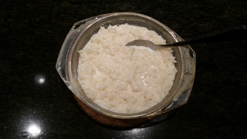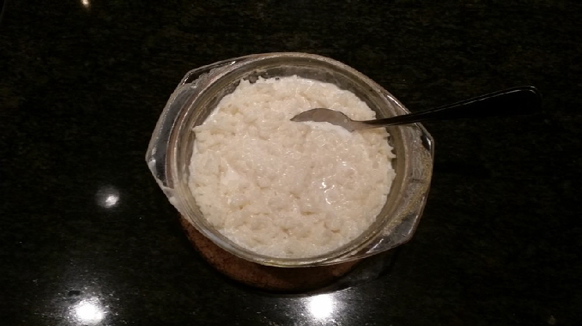 Das Wasser in der Glasschüssel aufkochen und vom Herd nehmen, den Zucker und den Reis hineinrühren. Nun die Milch hinzugießen. Die gezeigte Schüssel hier ist zu klein. Sie ist im Backofen übergelaufen… Sie sollte maximal halb voll sein, da der Reis stark quellen wird. An dieser Stelle könnte man 1-2 Esslöffel Rosinen zugeben. Das habe ich aber (noch) nicht selbst ausprobiert.Den Deckel auf die Schüssel legen und in den vorgeheizten Backofen stellen. Rost auf der 2. Schiene von unten, so dass die Schüssel in etwa im Zentrum des Ofens steht.Für etwa 45-50 min backen lassen. Herausnehmen und einmal gut umrühren. ACHTUNG! Die Schale ist natürlich sehr heiß. Topflappen nehmen und aufpassen, dass man sich nicht verbrennt. Vorsichtig probieren. Der Reis sollte schon weich sein, aber noch Biss haben.