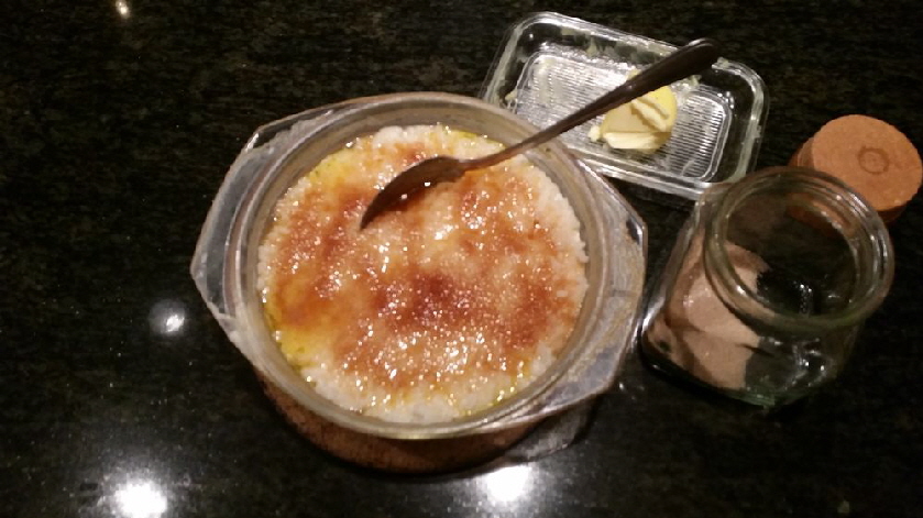 Ich kann mir vorstellen, zusammen mit der Butter noch dünne Spalten eines entkernten und geschälten Apfels mit auf den Milchreis zu legen. Dann erhält man gleich ein warmes Apfelkompott dazu. Das habe ich aber nicht ausprobiert.