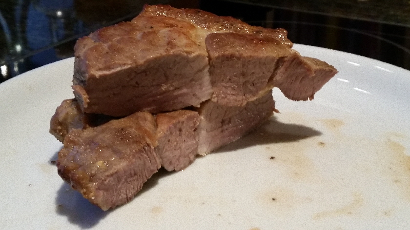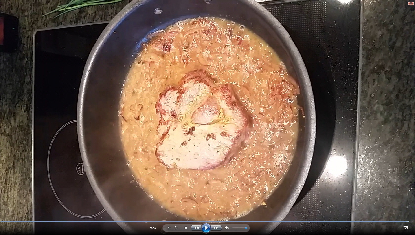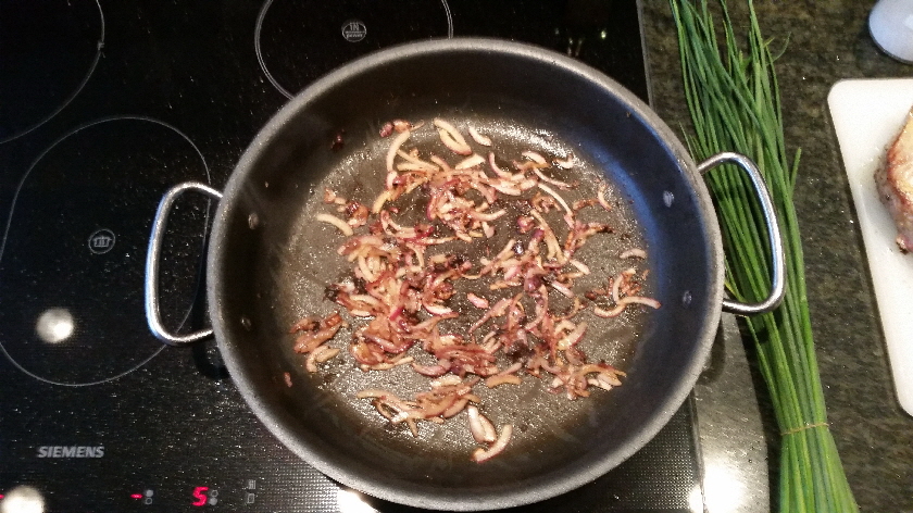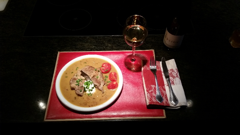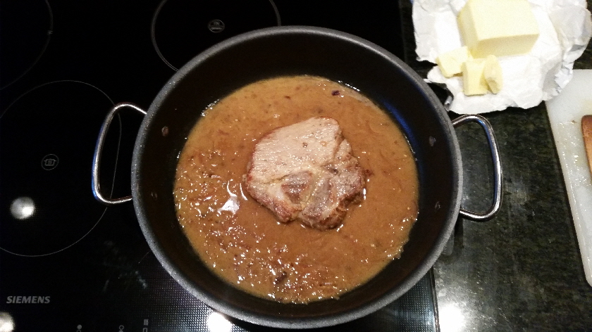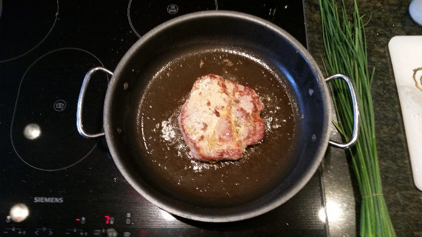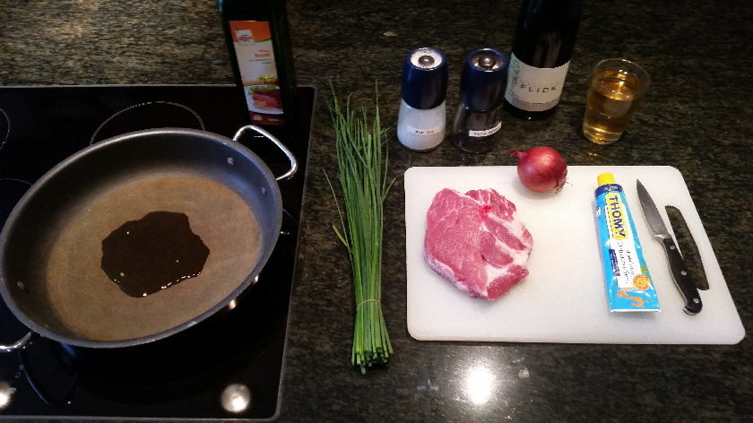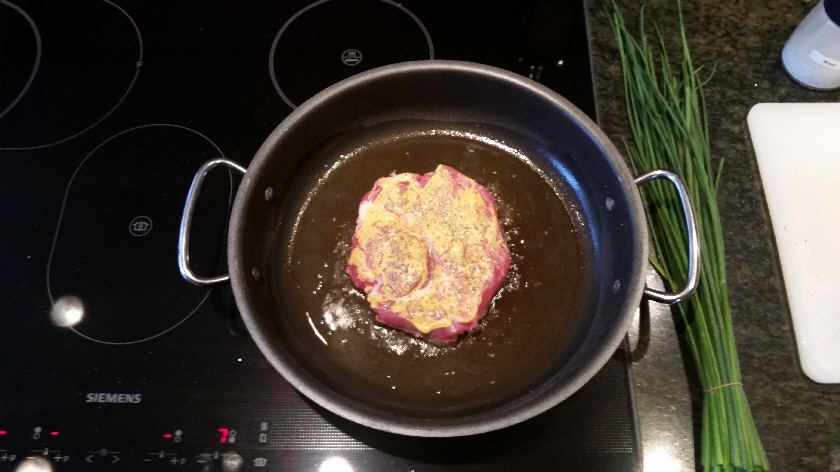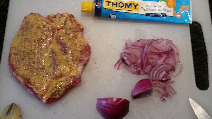 Den Backofen schon mal auf 120 °C vorwärmen. Ferner braucht man ein oder zwei Nackensteaks (meins hatte etwa 290 g und hatte keine Knochen), etwas Öl, eine Zwiebel, Salz, Pfeffer, Senf, ein Glas Weißwein = 200 ml, Optional noch einen Essl. Butter, etwas Schmand, etwas Schnittlauch. Zur Vorbereitung werden die Steaks auf beiden Seiten dünn mit Senf bestreichen, salzen und pfeffern. Das Öl in der Pfanne heiß, aber nicht zu heiß werden lassen. Bei mir war es die Stufe 7 (von 9). Dann das Steak auf jeder Seite für 2 - 2,5 min anbraten. Dann wieder herausnehmen und die Hitze auf 5 von 9 reduzieren. Ein Teil des Senf hat sich in der Pfanne etwas gebräunt es sollte aber nicht schwarz sein. Wenn es zu dunkel ist nimm es lieber mit dem Kochlöffel raus, denn es wird bitter. Wenn die Pfanne etwas abgekühlt ist die Zwiebel hineingeben; eventuell noch etwas Öl dazu. Nach wiederum 2-3 min einen guten Teelöffel Senf hineingeben, umrühren und den Wein angießen. Einmal kurz aufkochen lassen, das Fleisch hineinlegen und noch mal kurz für eine Minute aufkochen lassen. Deckel drauf und für 30 min in den 120 °C heißen Backofen. Nach 15-20 min das Fleisch einmal wenden. Wenn du magst und welchen parat hast, kannst du dir in der Zwischenzeit einige Schnittlauchröllchen schneiden. Nach den 30 min die Pfanne aus dem Ofen nehmen und das Fleisch in der Mitte anschneiden. Es sollte innen jetzt gegart aber noch etwas rosa sein. Jetzt immer schön vorsichtig: man vergisst gern, dass die Pfanne im Ofen war und verbrennt sich die Hände an den Griffen... Wenn du die Sauce noch etwas abrunden möchtest, kannst du jetzt etwa einen Essl. Butter mit einem Schneebesen oder Kochlöffel einrühren. Ist dir die Sauce zu sauer von dem Weißwein, tu noch eine Prise Zucker (aber wirklich nur eine Prise) dran. Ich mag es aber gerne etwas säuerlich. Nun kannst du die Sauce über das Fleisch gießen, eventuell noch einen Klecks Schmand oder saure Sahne dazu und den Schnittlauch darüberstreuen. Mir hat das Steak zu Vollkornbrot und einem Gläschen Weißwein geschmeckt.
