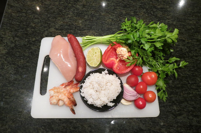 Zunächst werden alle Zutaten eher grob in Stücke geschnitten. Die Zwiebel und den Knoblauch in etwas Öl glasig dünsten. Dann als erstes die Hühnchen Stücke mit anbraten, bis sie etwas Farbe angenommen haben. Dann die Wurst und die Paprika zugeben und einen Moment mit braten lassen. Dann die Tomatenstücke und etwas Paprika-Pulver (rosen-scharf) unterrühren , kurz aufkochen und für etwa 15 min auf kleiner Flamme schmoren lassen. Am Ende die Garnelenstücke und den gekochten Reis mit untermischen und noch für 5 min heiß werden lassen. Mit Salz und Pfeffer abschmecken und auf einem Teller anrichten. Mit Limettenstücken und gehackter Petersilie servieren.