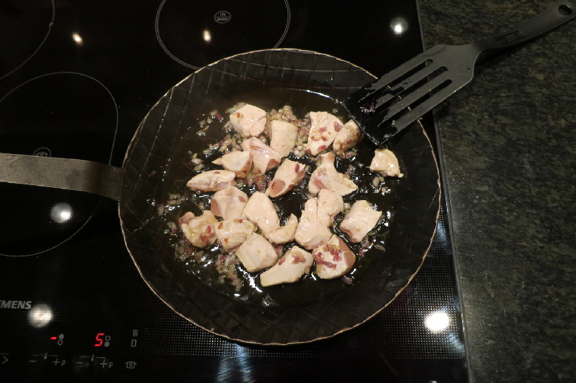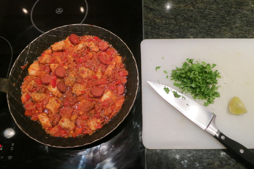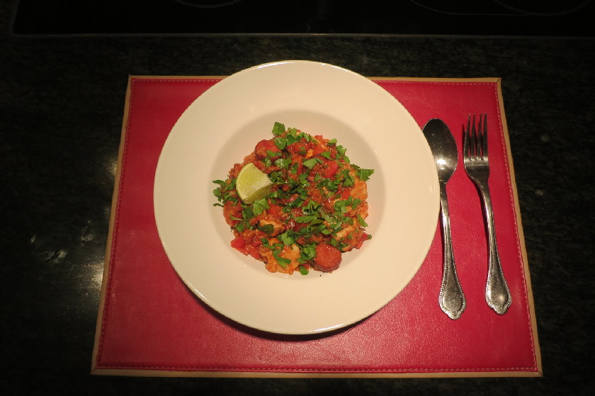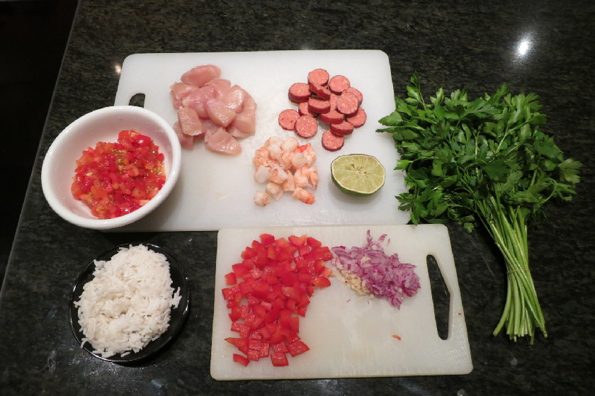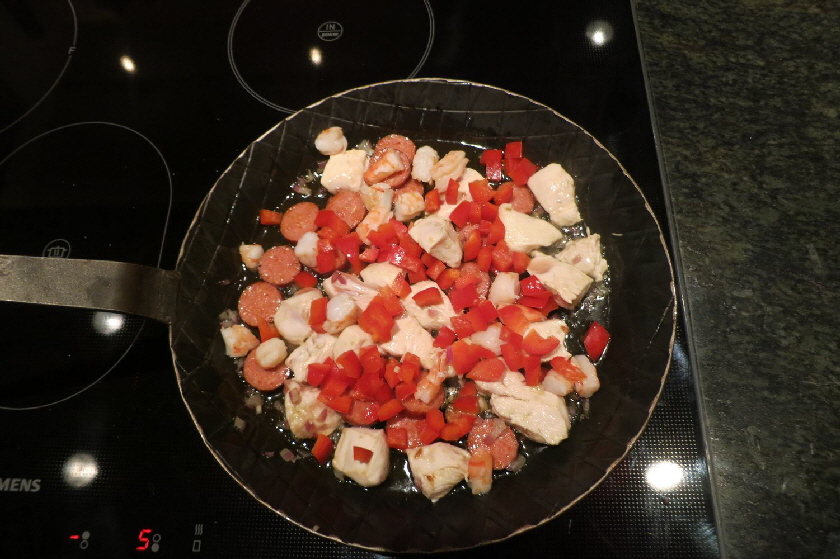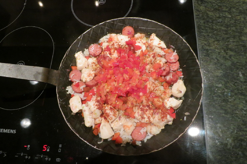 Im gezeigten Fall habe ich Hühnchenbrust, Kabanossi (es geht auch Chorizzo, oder eine andere pikant gewürzte Wurst), Garnelen und Paprika sowie Tomaten verwendet. Außerdem sind noch Zwiebel, Knoblauch und gehackte Petersilie mit dabei- Etwas gekochter Reis bildet den Unterbau.